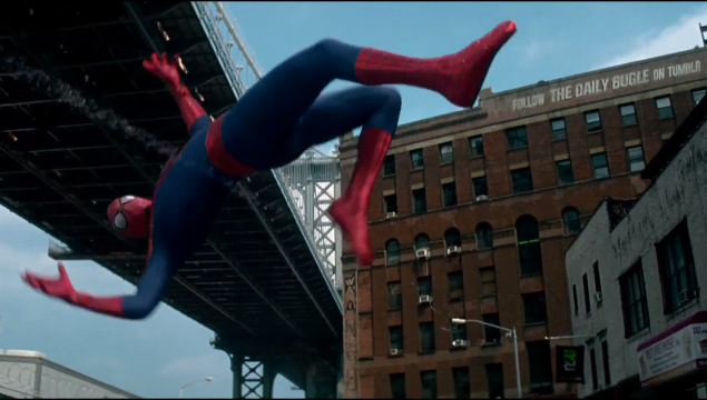 We all know that Peter Parker worked at The Daily Bugle as a photographer to make a few extra bucks for his projects and to help his Aunt May. Well, while swinging in action at the 40 second mark, we see a sign in the background that reads “FOLLOW THE DAILY BUGLE ON TUMBLR.” Turns out that you really can! Thedailybugle.tumblr.com posts fictional news articles regarding Spidey sightings, Oscorp shenanigans, and other fun Easter eggs. It’s definitely something Spidey-fans should check out.